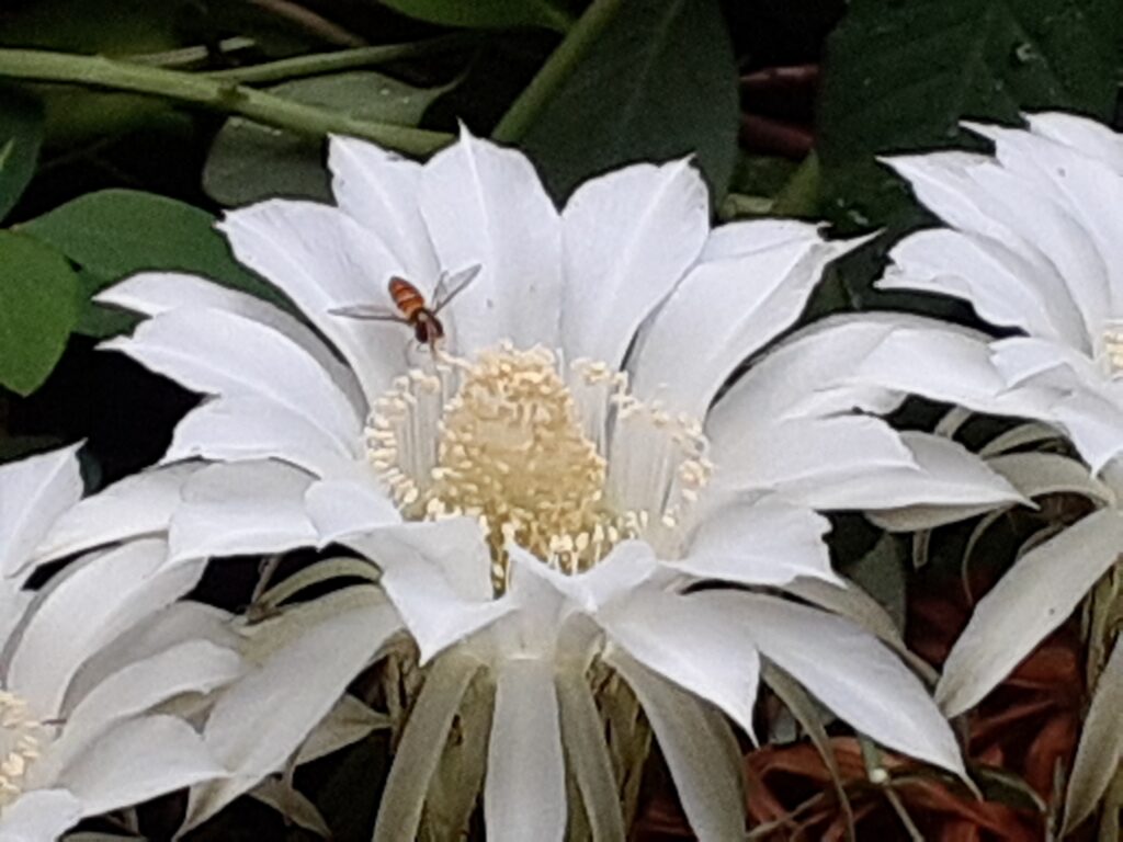 今になってサボテンの花が3つも咲きました。一夜花です。清々しい香りがします。小さなハチが来て密を吸っていました。