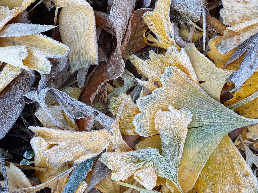 息が白く、今年一番の寒さです。銀杏の葉っぱに霜が降りていました~🎵