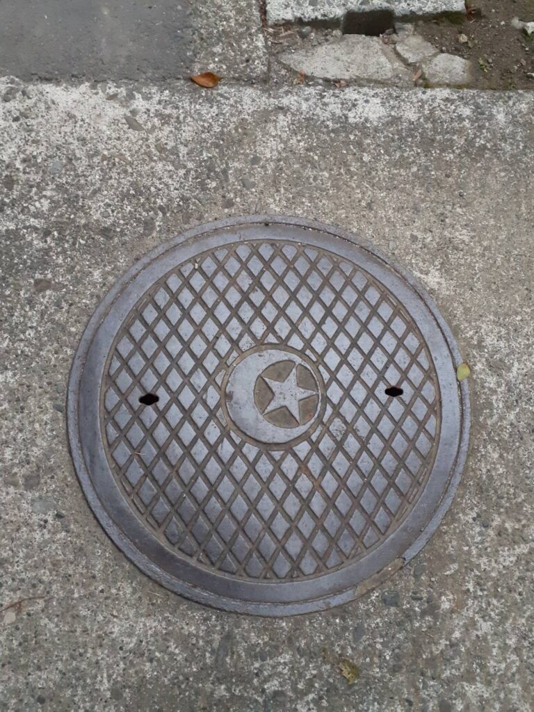 月影谷にゴジラ?? / 観光 わ~ゴジラが出た~! 月影谷で昨秋、枝払いがありました。以前、山を見ると天空にゴジラ?が見下ろしていました。驚いた~ 月星印のマンホール。稲村ケ崎小学校の先にあります。鎌倉で現存するただ一つのマンホールのふたです。