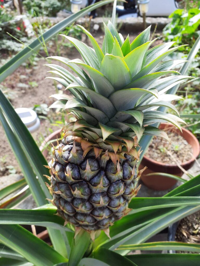 十一人塚前のお宅にはパイナップルの花が咲いています。食べた後の頭の部分を植え付け3年目に花が咲き熟します。鉢は大きめが良いとの事です。