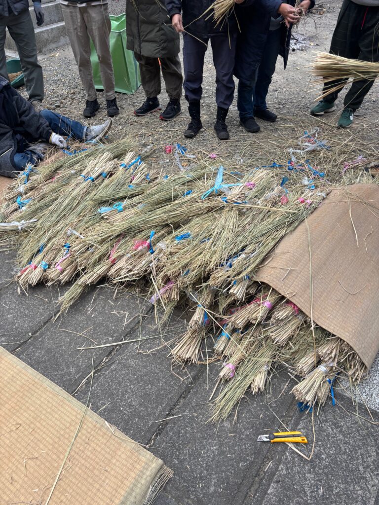 みんなで藁をつなげ、締めて、立派なしめ縄が完成いたしました。