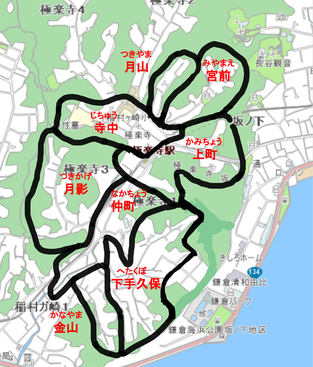 第4条 (構 成) この会は、下にあげる極楽寺および稲村ケ崎の諸地区居住者で、所定の会費を納入する者をもって構成する。 地区名:上町、宮前、月山、寺中、仲町、月影、下手久保、金山