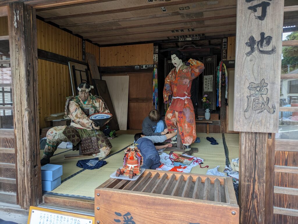 6月30日~1週間、八雲神社のお祭りが有ります。導地蔵にて八幡太郎義家と鎌倉権五郎景政の武者人形の着付けが本番に先駆け練習(5月12日)があり立ち会わせて頂きました。着付けを覚えるのも大変と感じました。また6月2日からは
