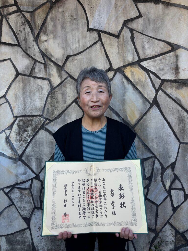 広報かまくら12月号をご覧になった方はご存じだと思いますが、極楽寺自栄会の役員でもある長雄さんが市政功労者表彰の社会福祉功労者として表彰されました。おめでとうございます。極楽寺自栄会でも極楽寺サロンやバス旅行の企画など、